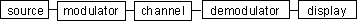 Think of a machine or a system that performs a function and can be explained by a block diagram, like a data modem. The first step in creating a block diagram is to functionally decompose the design. Figure A-1 shows an entire modem communications system containing a source, modulator, transmission line or "channel," demodulator, and display. Each box can be a subsystem, a single function, or a representation of some physical phenomenon like a communications transmission (atmosphere or fiber-optic cable).