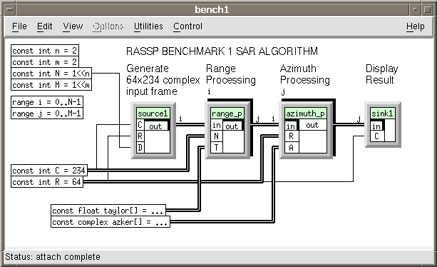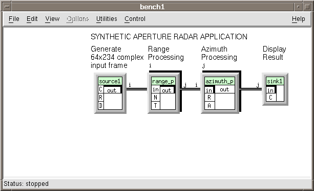 The SAR application had four parts: simulated source (in place of a real time source/sink), simulated display (instead of a real radar scope terminal), and two data-processing segments. The interesting part of the application design was building it in sections that could be concurrently executed; therefore, the distribution method was important.