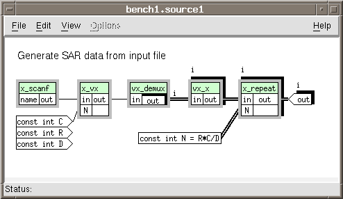 Instead of having a real radar source, the input data was simulated by reading a formatted file of radar return-like data. The data was converted to vectors for each scan, which could be independently processed. The next part was to demultiplex each scan line down a different path to be processed concurrently. Because the file contained information about only one image instead of a continuous stream of images, developers used the image many times. Hence, the x_repeat box. This box was specially created to take as input a specified amount of data and continuously output that data. See Figure A-3.