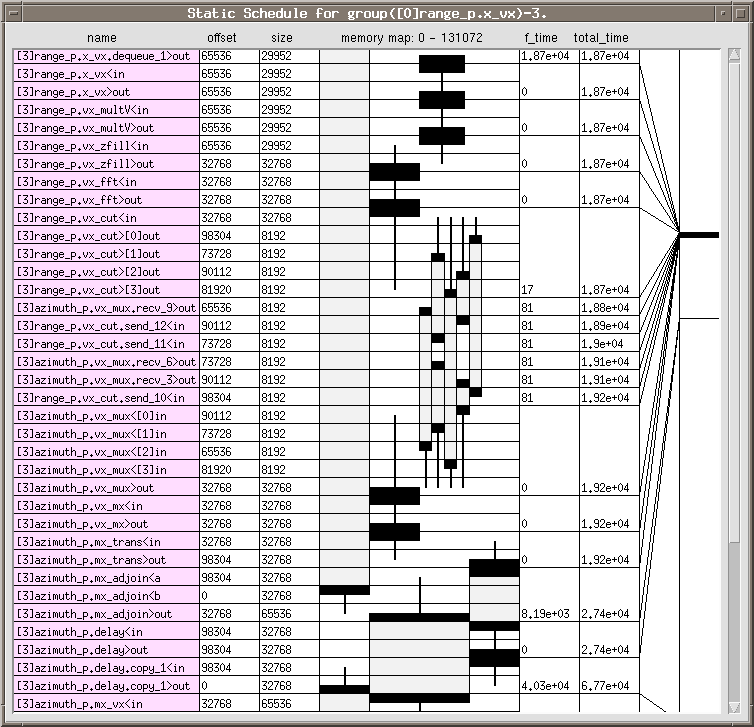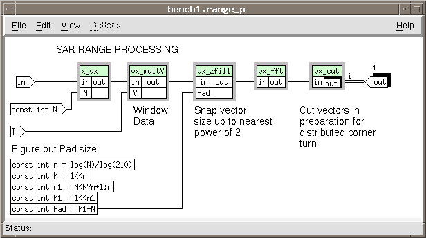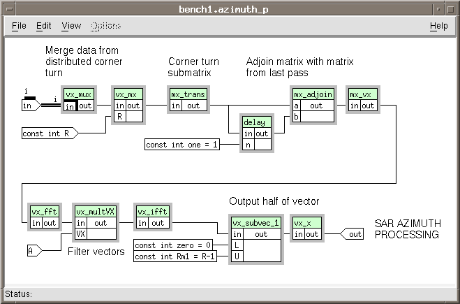 This part of the processing takes a complex FFT on a zero-padded fixed-size vector. After the FFT was calculated, developers cut the vector in preparation for the "matrix transpose" prior to azimuth processing. The bulk, or coarse granularity, of the transpose would be accomplished through the connections. These connections would be between different processors.