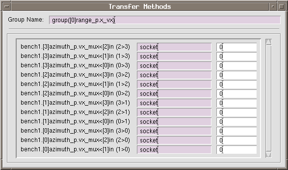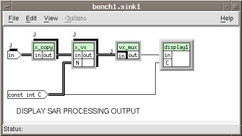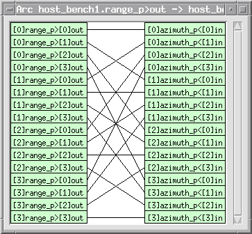 Double click on the family connection between the sar _ range and sar _ azimuth boxes. The connection pattern made is between a family of boxes indexed on "i" with a family output to a family of boxes indexed on "j" with a family input. This does not create an "all to all" connection scheme. Instead, the undefined family I/O indices are instantiated with the index of the box to which it is connected. The connection pattern is then between [j]i ' [i]j. Figure A- 9 the defined data-path pattern when this connection is made.
