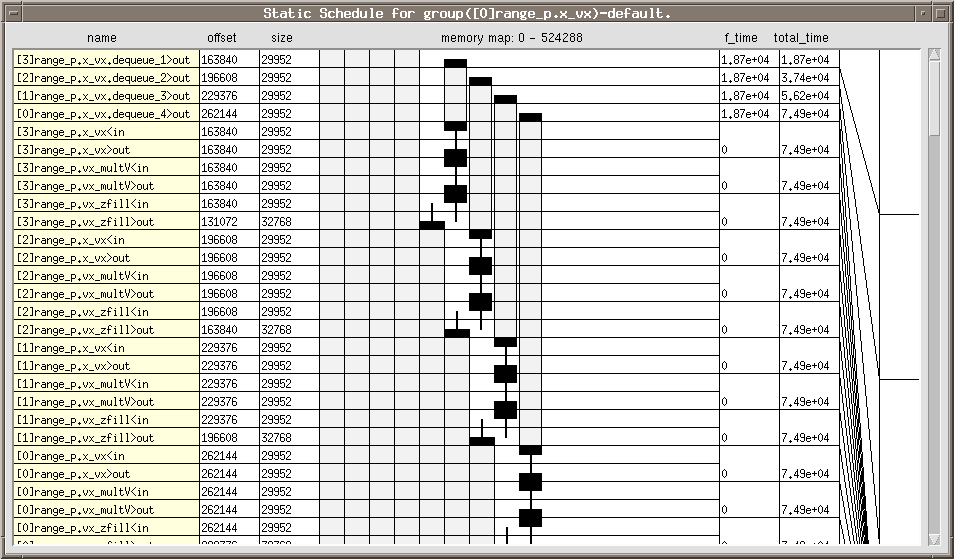 Select GC Display Schedules. . . . The " Static Schedule " of events that opens lists every function and every data transfer that is required for the execution of the application. Because the application has not been partitioned into smaller execution units, GEDAE™ executes, by default, the application on a single host processor. The application will execute on a single processor even if the host is made up of multiple processors. To take advantage of multiple internal processors, the application must be partitioned and the partitions mapped to separate processors.