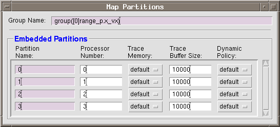 After partitioning the application, the next step is to select on which processor each partition will execute. In this dialog, assign a " processor number " corresponding to the partition name. The processor number is a specific designation from the " embedded/embedded_config " file and it is a hardware-specific name listed under listed under " Processor_Desc. "